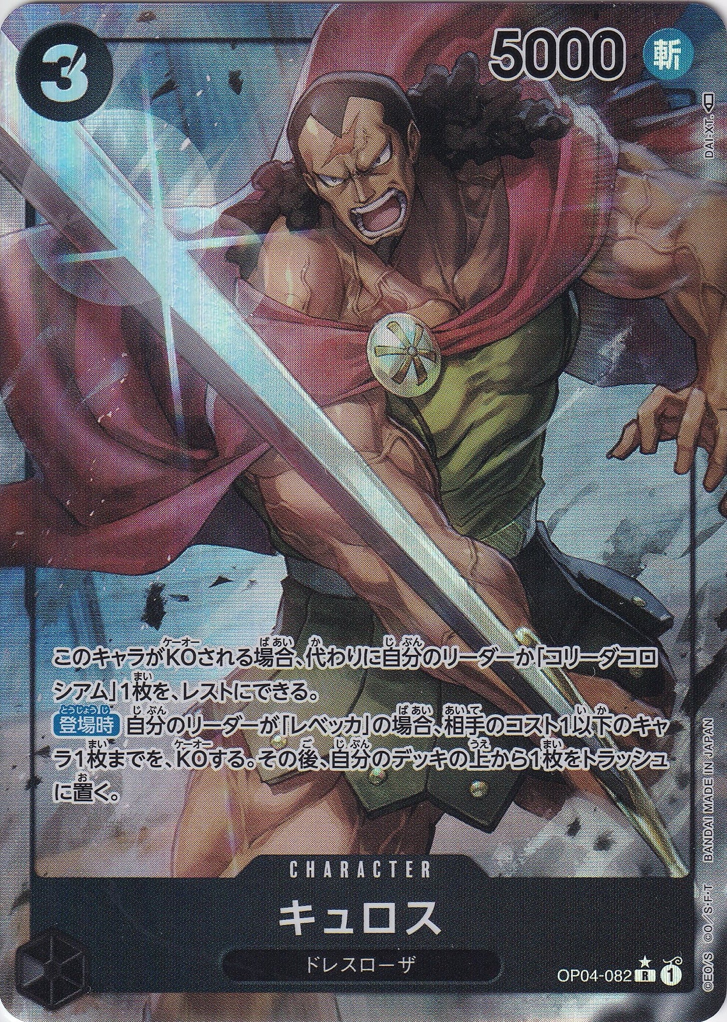 - このキャラがKOされる場合、代わりに自分のリーダーか「コリーダコロシアム」1枚を、レストにできる。【登場時】自分のリーダーが「レベッカ」の場合、相手のコスト1以下のキャラ1枚までを、KOする。その後、自分のデッキの上から1枚をトラッシュに置く。