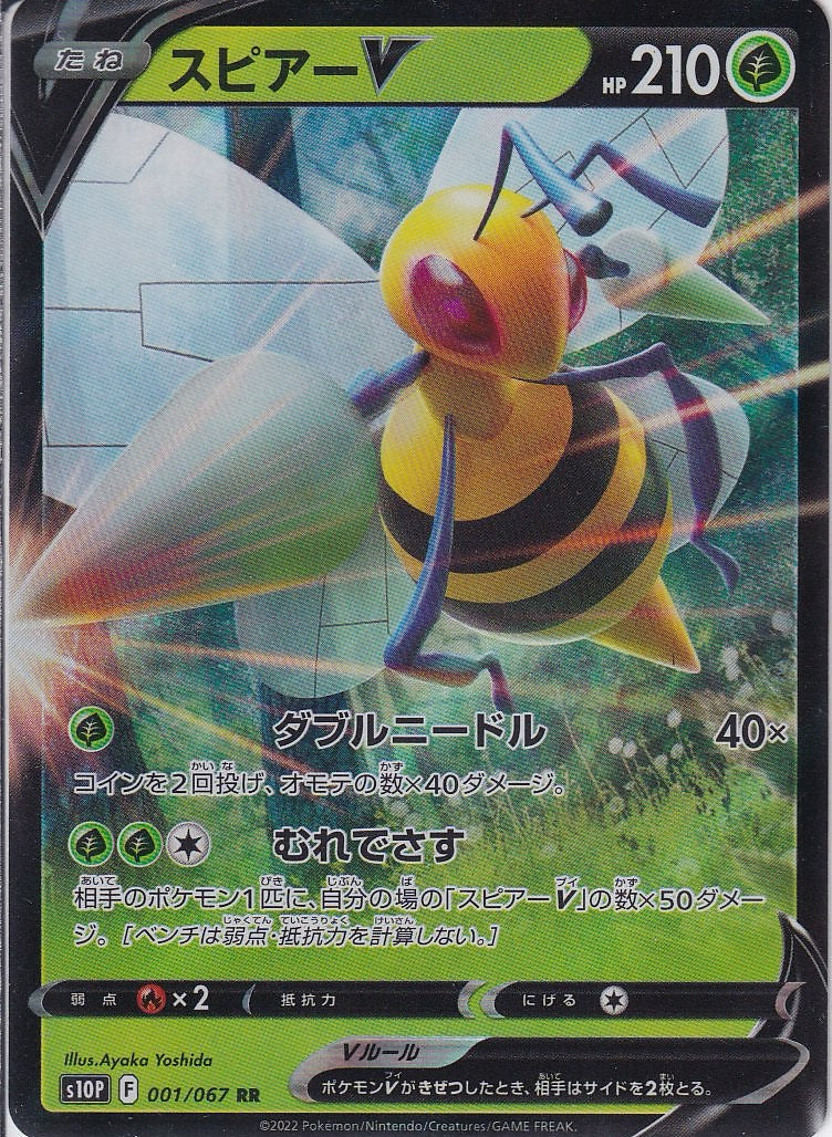 - | 相手のポケモン1匹に、自分の場の「スピアーV」の数×50ダメージ。[ベンチは弱点・抵抗力を計算しない。] |