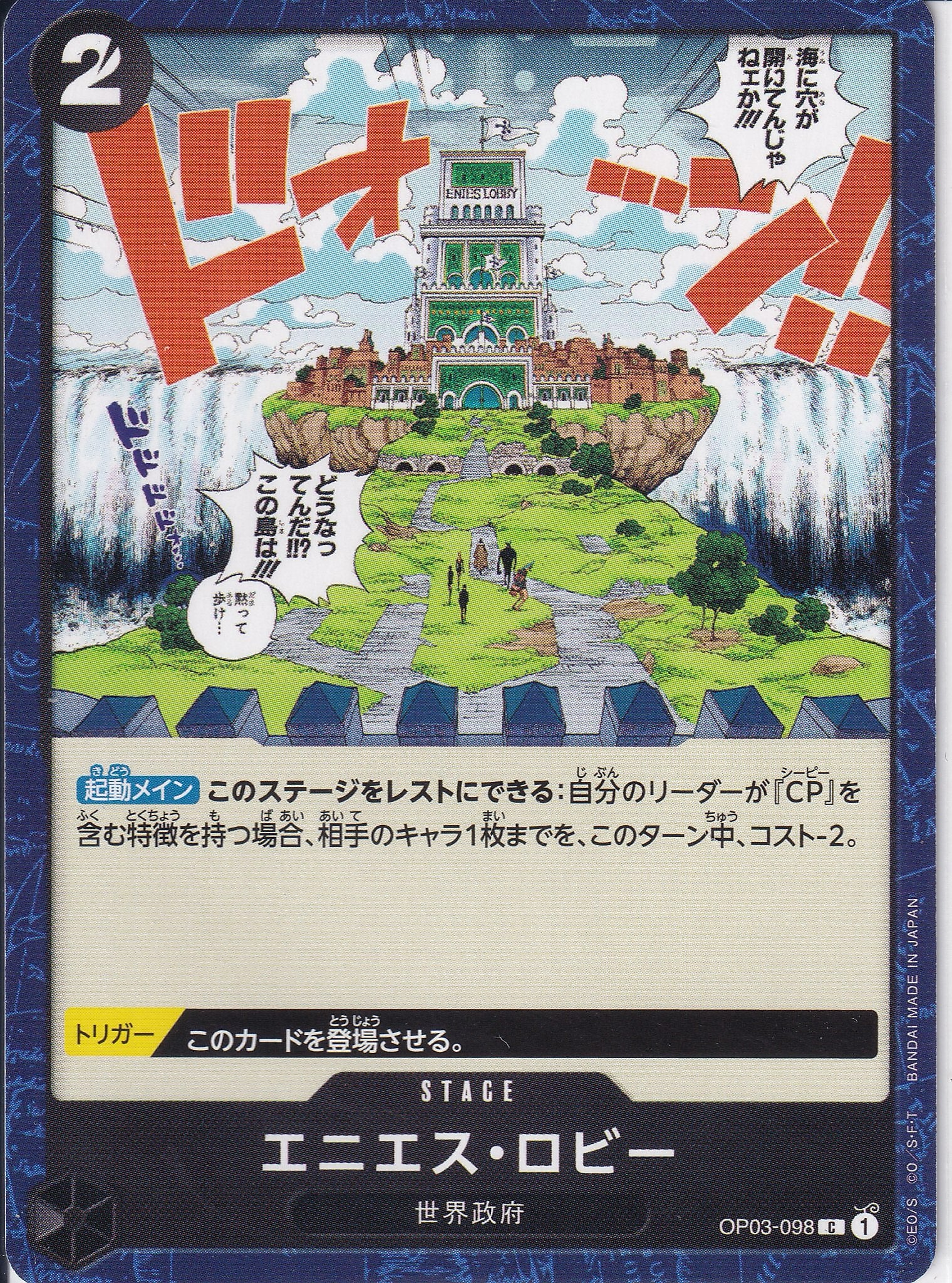 - 【起動メイン】このステージをレストにできる:自分のリーダーが『CP』を含む特徴を持つ場合、相手のキャラ1枚までを、このターン中、コスト-2。